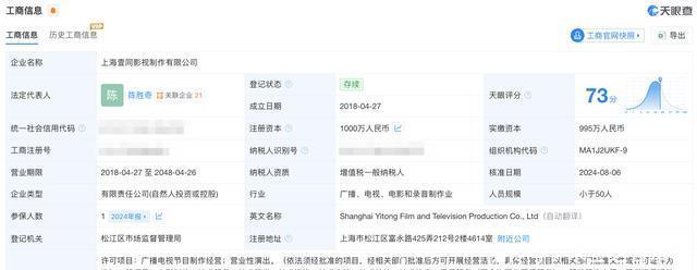公开信息显示,“壹同影视”专注影视产业升级与原创IP开发,覆盖电影、剧集、艺人经纪及IP全链运营,旗下艺人包括刘昊然、佟丽娅、荣梓杉、文咏珊等。